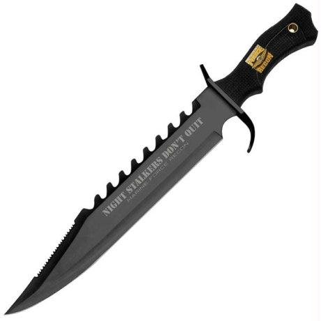 When the Marine Force goes into the night they need a knife that will get the job done. They carry this 16 3/4" stalker with a 12" 420 stainless steel blade with a double-serrated back edge. A rubberized handle features the Marine Force Recon logo and the whole package fits snugly in the include nylon sheath. Overall Length: 16-3/4"Blade Length: 12"Sheath: Black Nylon